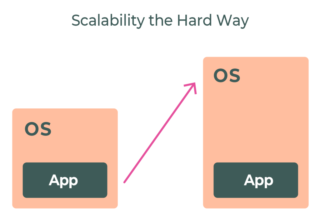 In the old monolithic architecture, scaling was exceedingly difficult. Once an application was written, frequently the only option was to run larger VMs in order to handle additional traffic. Simply put, the answer to higher traffic volumes was to 'throw hardware at it' (below).
