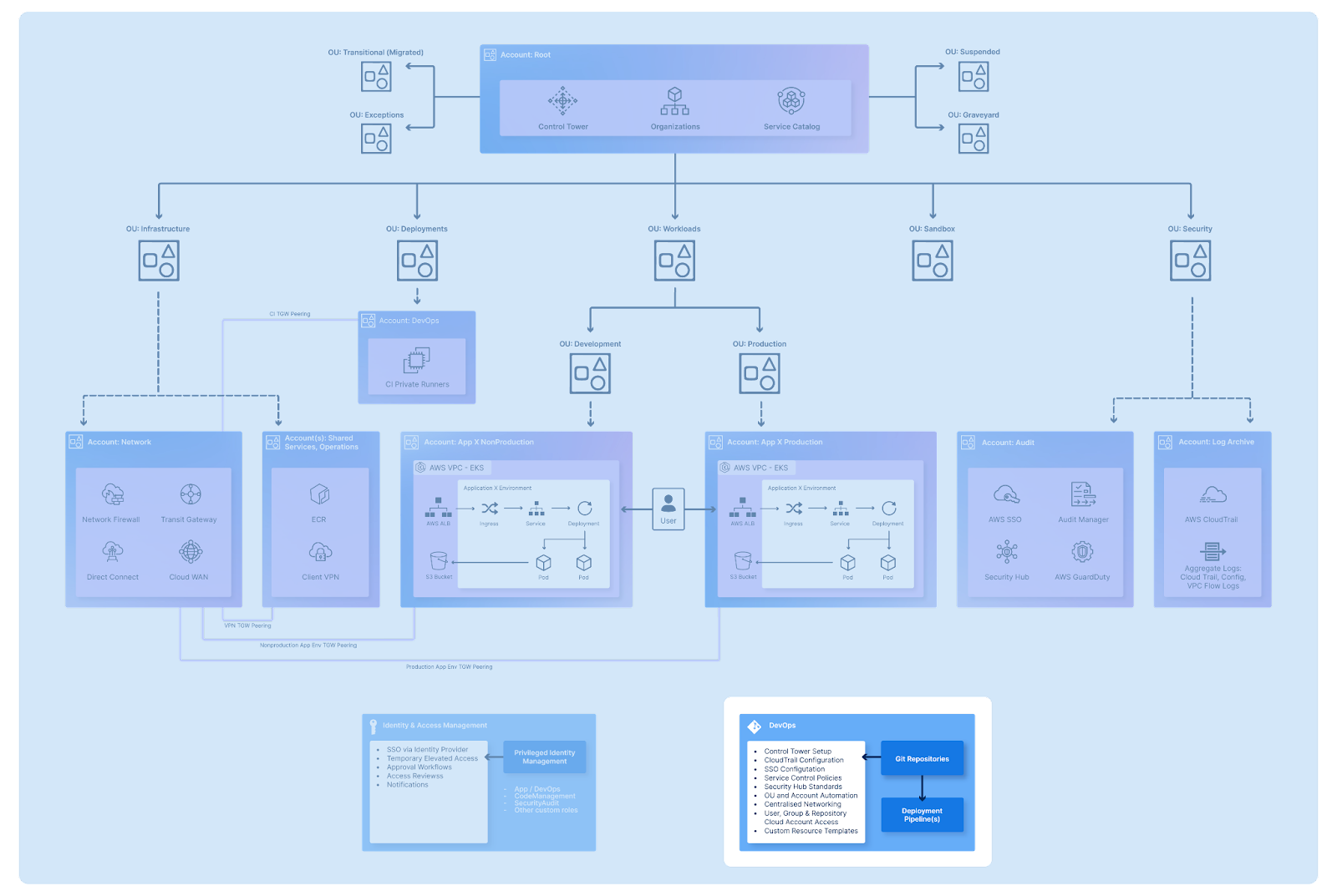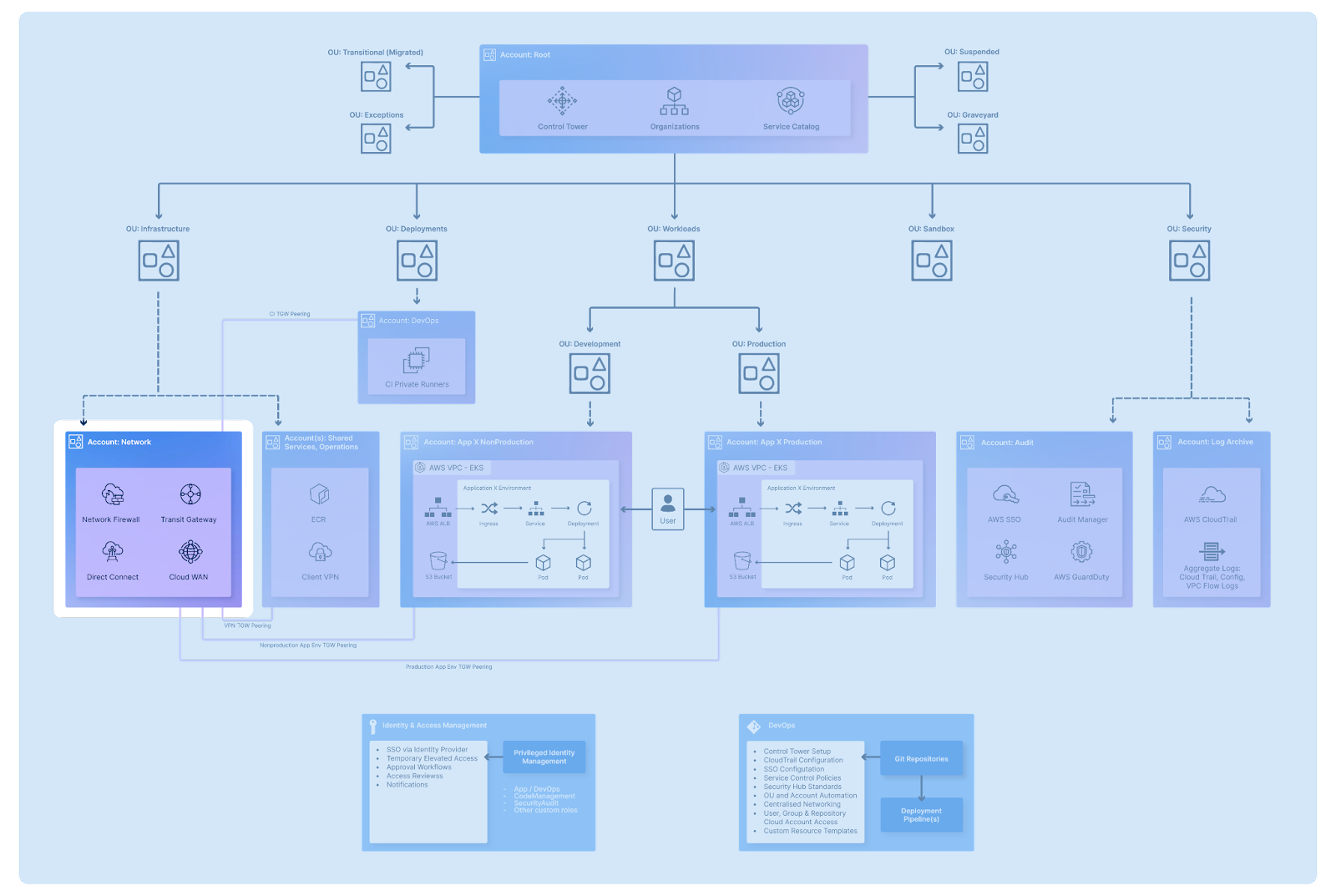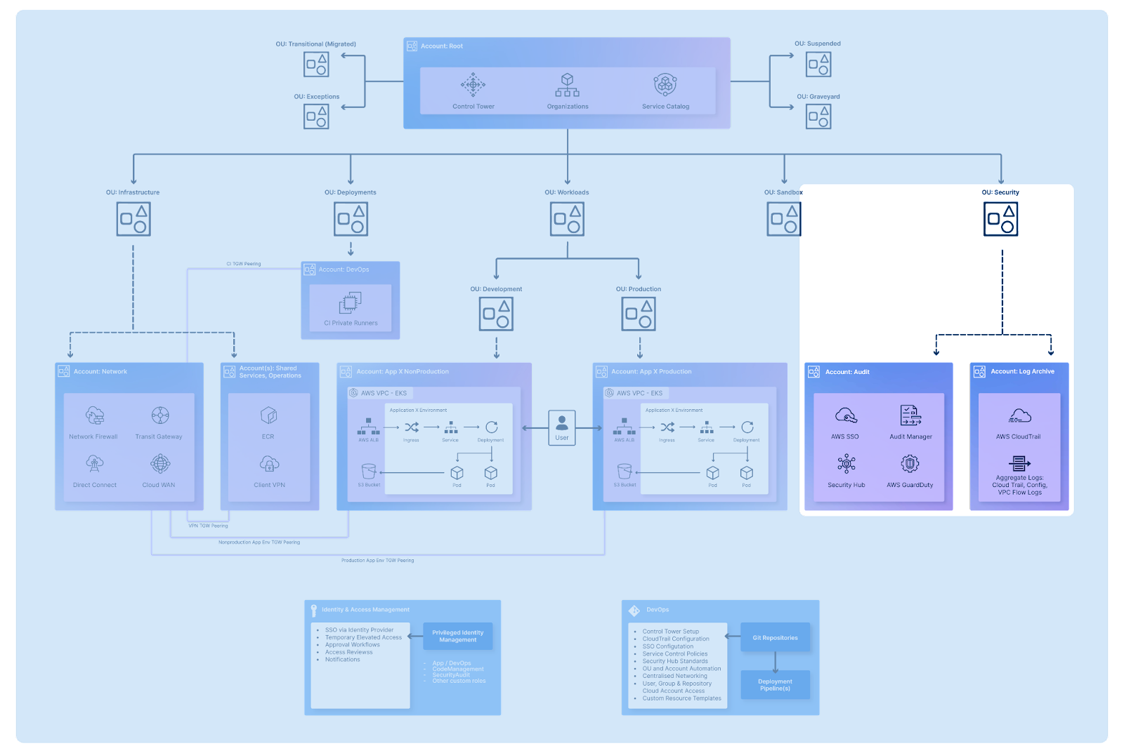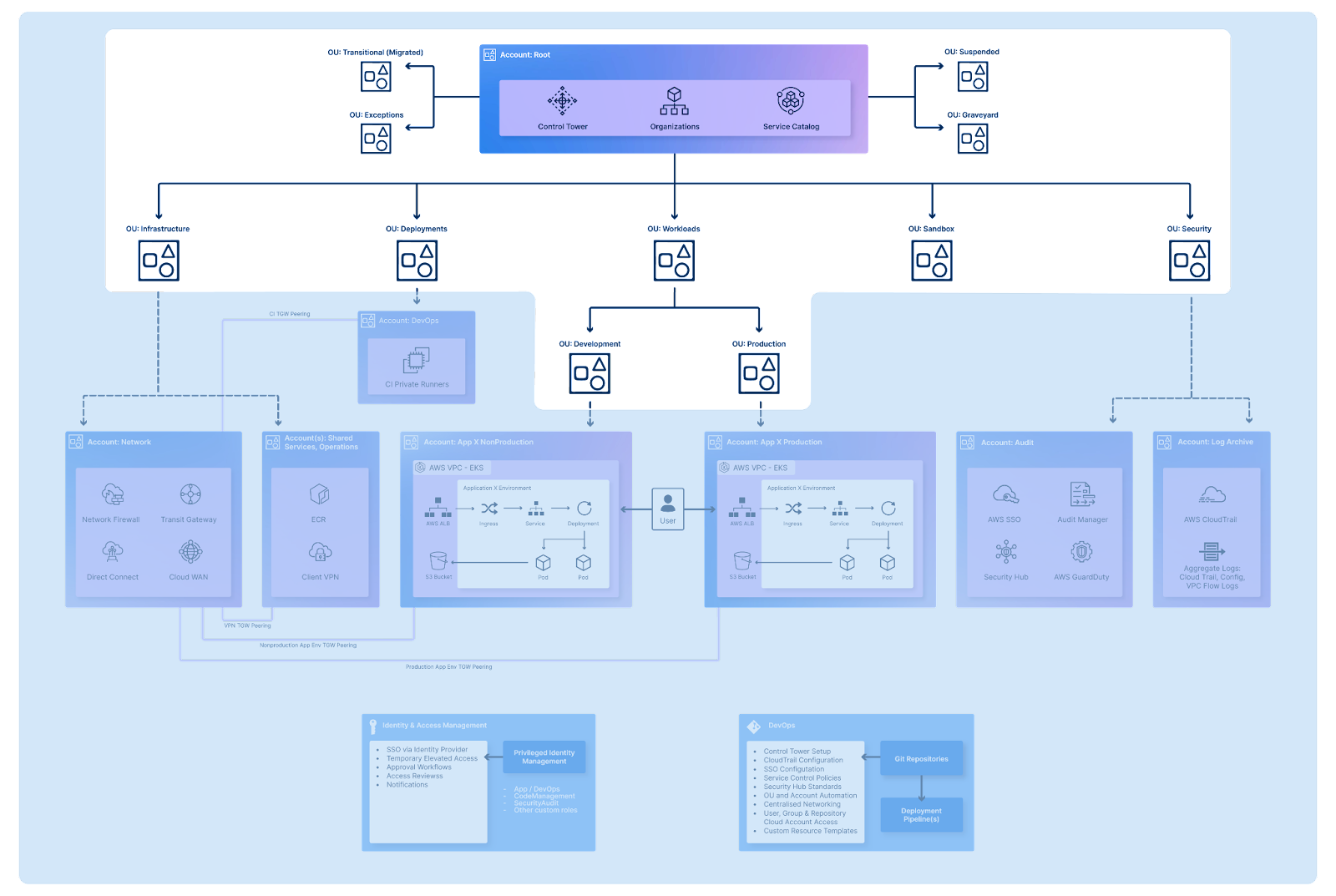One of the most fundamental design considerations is your AWS account setup for your organisation. Although there are different ways in which your organisation could structure your accounts and organisational units, AWS account structure practise advise on the following multi-account set up: