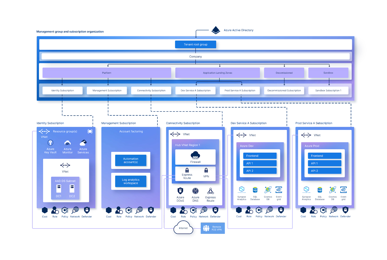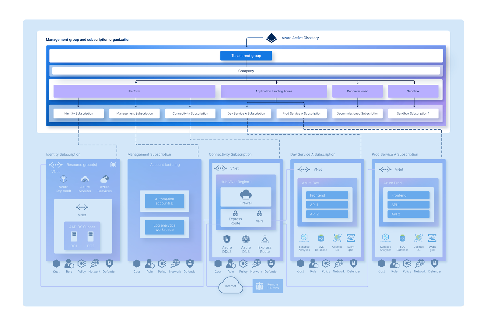 The following diagram from Microsoft gives an opinionated target architecture for your Azure landing zone architecture and can be used as a starting point to tailor to your organisation’s needs: