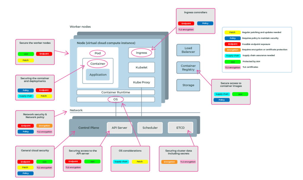 Applications in a Kubernetes cluster run in containers within a virtual server called a node. That node has, amongst other things, a host operating system and container runtime (which runs the container). Both of these components require attention within your Kubernetes security posture as a breach in a host will compromise everything you are running there, including Kubernetes and the workloads inside.