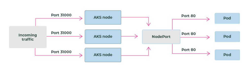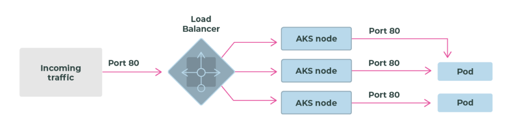 Uses a load balancer resource that has an external IP address that connects to the requested pods. To allow customers' traffic to reach the application, load balancing rules are created on the desired ports.