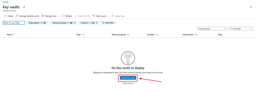 The Azure Key Vault dashboard allows you to perform tasks such as creating, managing, and deleting vaults. Click Create key vault to create your first vault: