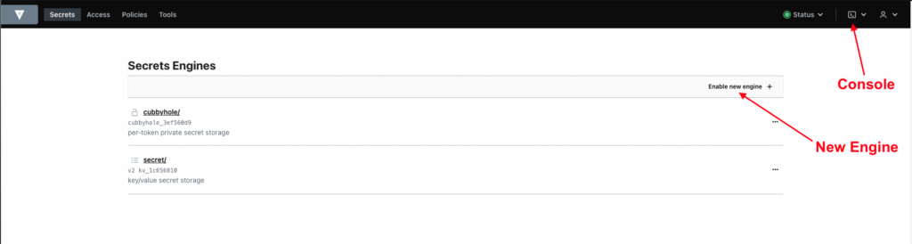 One of the first steps to using Vault is to set up a secrets engine, which you can do from the dashboard: