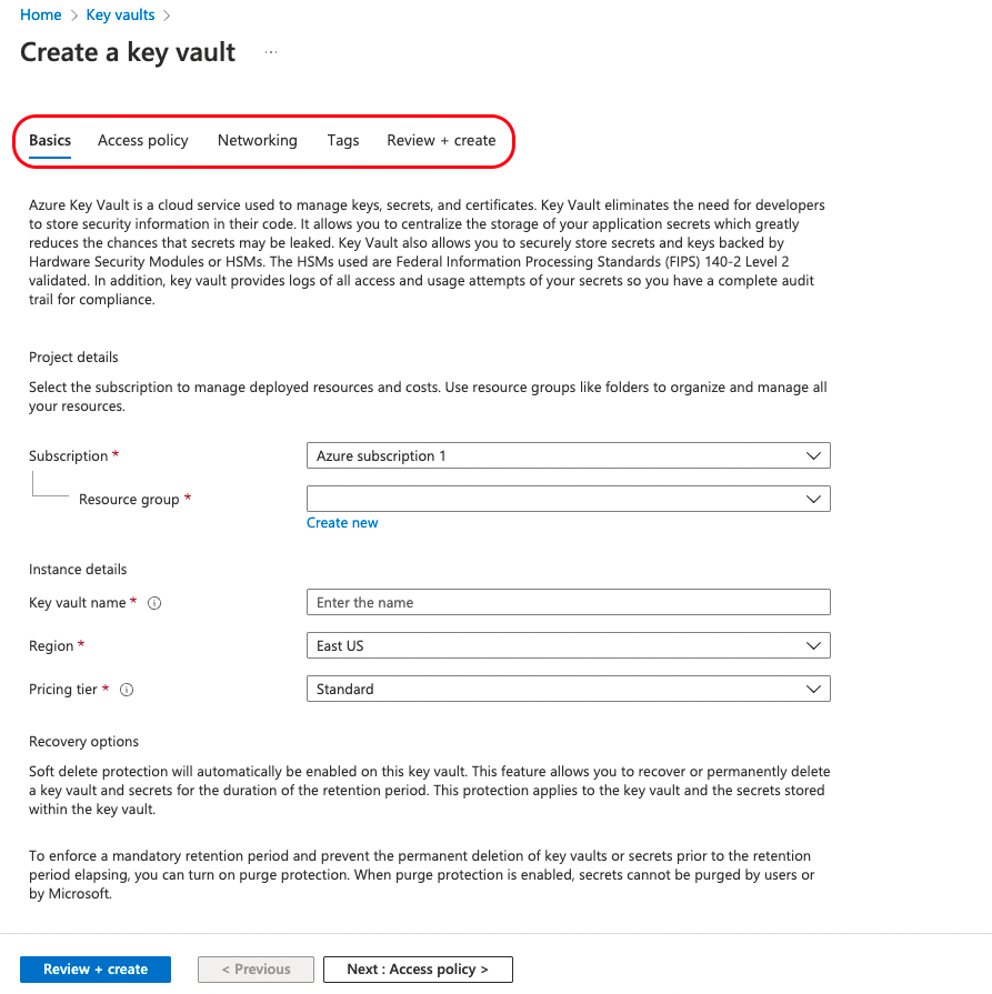 On the next screen, youβll be able to assign a name to the vault, select a region and pricing tier, and assign access policies. You can learn more about creating a key vault using the Azure portal in the quickstart guide.