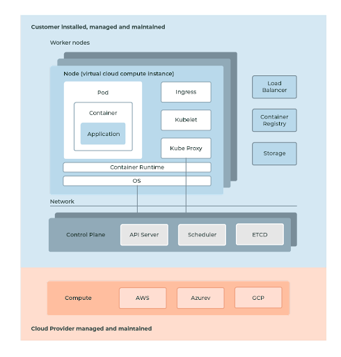 Opensource, OpenShift and Tanzu give you ultimate control in building and managing Kubernetes clusters, it is up to you to install, manage and maintain all of the components in your platform and infrastructure that make up Kubernetes. You are responsible for managing the compute (servers), control plane (core services needed to run Kubernetes clusters), networking and storage.