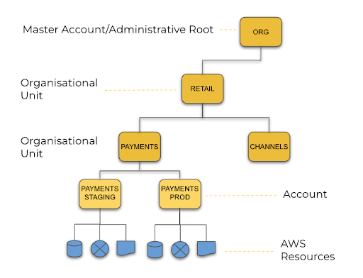 The core of organising AWS resources and usage lies in two container structures, AWS Accounts and organisational Units.