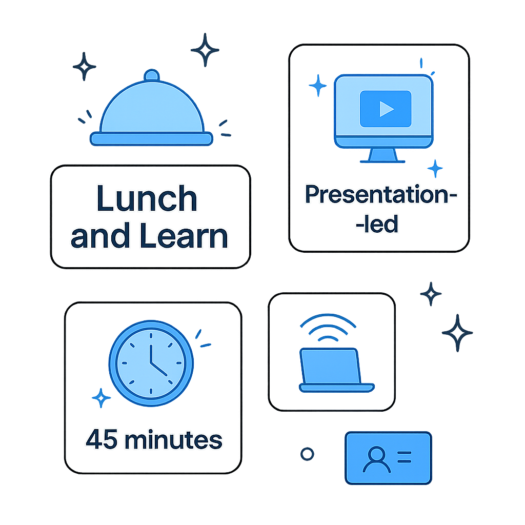 Organisations trust the Lunch & Learn format because it works. Upskill, voice questions, and see what 'good' looks like.